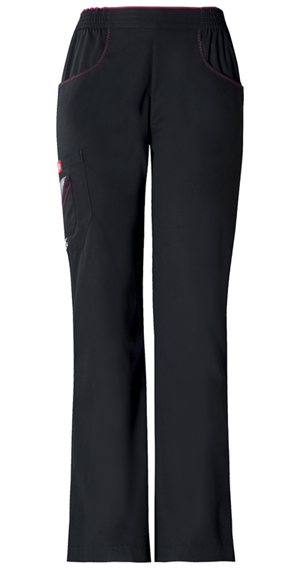 Want to add a little extra “oomph” to your all-black look? We love the red stitching on these junior fit, mid-rise, straight leg pants. They feature a flat front and super flattering elastic waistband that starts at the pockets and circles around to the back. The inside waistband has an awesome peek-a-boo print detail and contrast merrow edge stitching. Final touches include two rounded pockets, a large cargo pocket with an additional exterior pocket for extra storage, a contrast loop tab with a D-ring and side vents. (Mid-rise pull on cargo pants, (Dickies Medical)