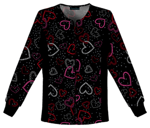 While some warm-up jackets can be a little baggy, this one is definitely more sporty. The black knit side panels add shape and are visually slimming. Ribbed knit cuffs let you push up your sleeves and get to work right away. The “Unchain My Heart” print has a field of linked hearts tumbling against a black backdrop that appears to be sprinkled with snow flurries. Pair it with a shocking red or pink scrubs top underneath.