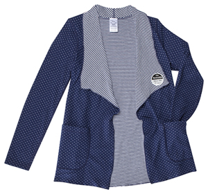 This is the find of the season—the cutest warm-up jacket on the market. This cardigan-style charmer has a Swiss dot pattern of white and blue on one side with blue and white pinstripes on the other. It’s a cozy, stretchy double face jersey knit for maximum snuggle factor. The waterfall lapels mean you never have to worry about losing a button or getting a zipper snagged. With patch pockets on the stripey side and the spotty side, we bet a lot of nurses are going to stuff these jackets inside and out with gear. Wear it over a crisp white scrubs top to look your best on every shift.