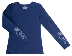 Do you like to mix it up with your layers? You can try something new with this odd couple. Start with a navy long sleeved, screenprinted T featuring floral swirls. It looks a little too relaxed for the workplace on its own. But it’s just right if you add a white button down scrubs top with classic fit and patch pockets. And that lapel is just begging for a decorative holiday pin!