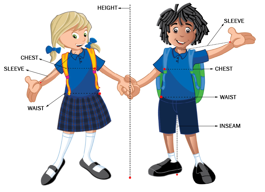 To ensure that uniforms fit properly, it’s important to get accurate measurements. We suggest placing two fingers within the circumference of the tape when measuring the child, as this is a proportional amount to allow for breathing ease. If the child is in between sizes, it’s often good to purchase the larger size to accommodate for growth. Many All Uniform Wear school uniforms feature adjustable waists and other growth features so the child won’t outgrow them as fast.